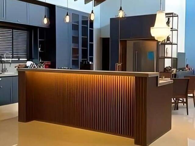 Imóvel a venda contemplando armários planejados provençais, cortinas de fino acabamento, ar condicionado em todos os cômodos, cooktop, forno elétrico, adega (eletrodomésticos da marca Brastemp), lustre de cristal e pendentes.